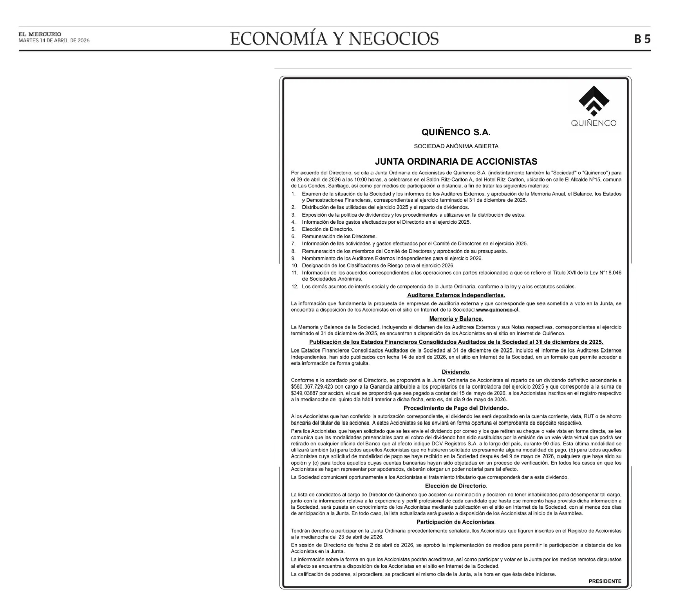 14/04/2026: Aviso Citación Junta Ordinaria de Accionistas