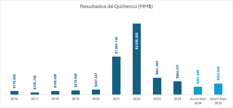 - A septiembre de 2025, la ganancia neta de Quiñenco ascendió a los $552.564 millones, lo que representa un alza de 41% respecto del mismo período de 2024.